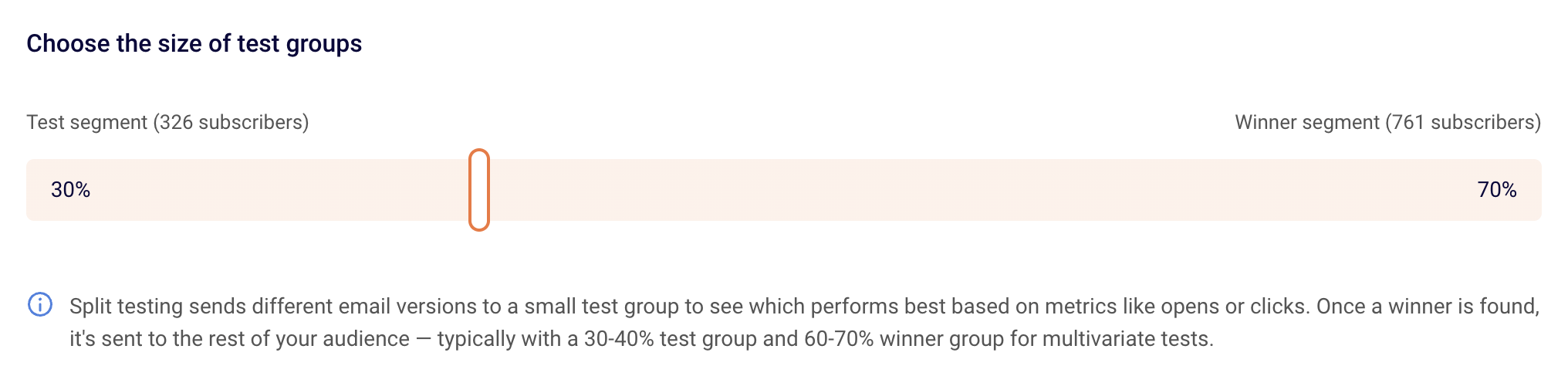 • Test Group Size: Define what percentage of your total audience will receive the test. For example, if you’re sending to 1,000 subscribers, you might choose 30% (300 people) for testing.
