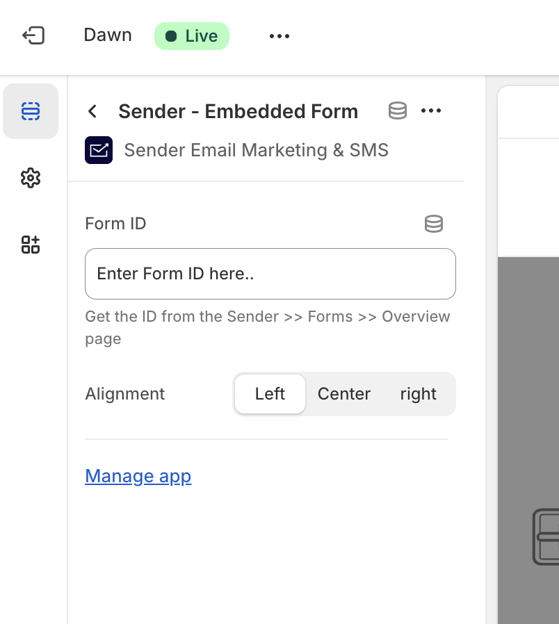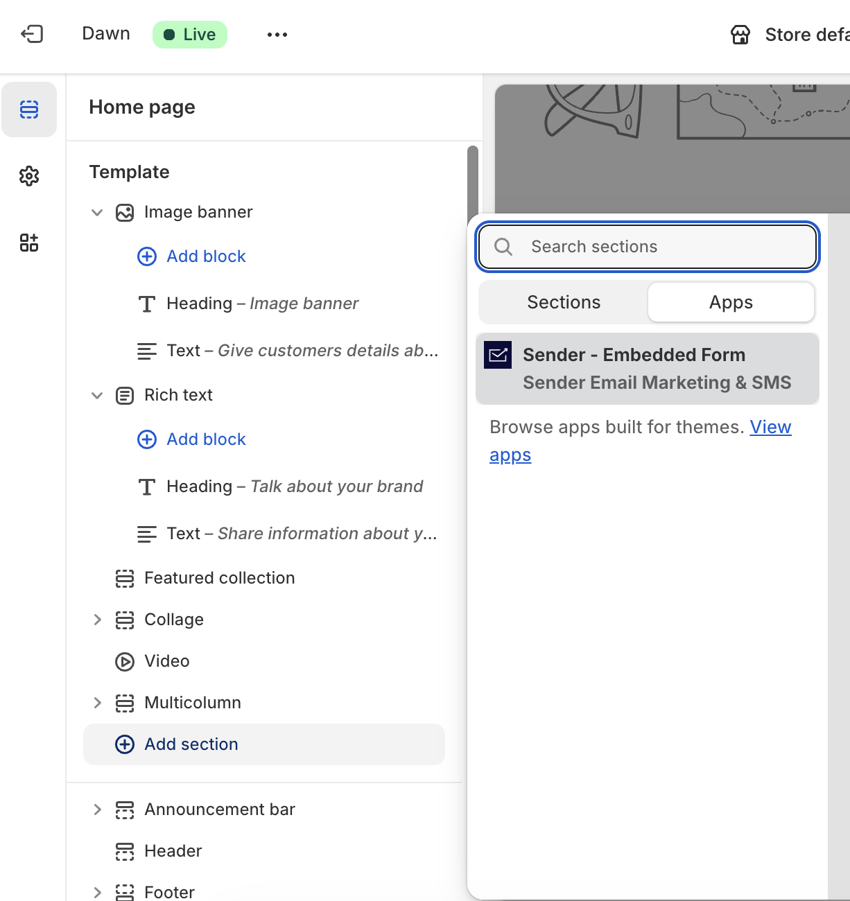 Now head back to your store site editor and choose to add a section and in the Apps section choose Sender – Embedded Form.