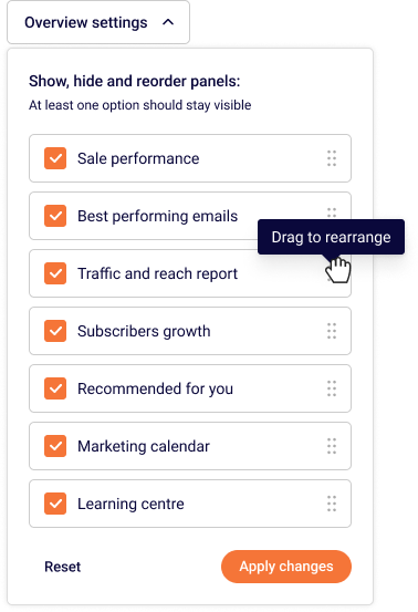 • Overview settings – you can customize the layout of your dashboard by dragging and dropping sections to organize it exactly how you want. You can also exclude sections from the dashboard that you feel are irrelevant to you by unticking the boxes.