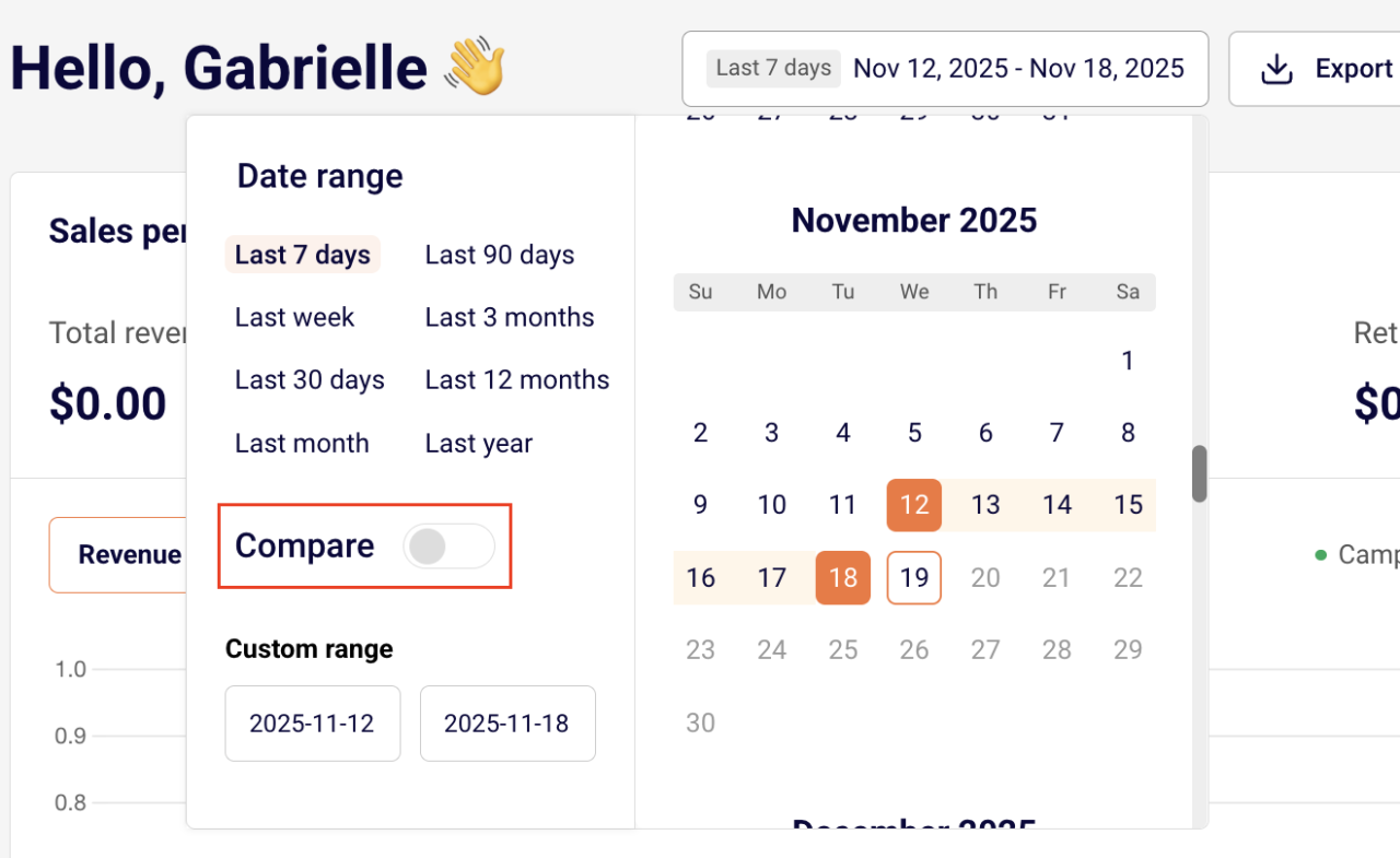 Enable comparison mode to analyze how your current performance stacks up against previous periods. For example, compare the last 30 days with the previous 30 days to identify growth trends or areas needing improvement.