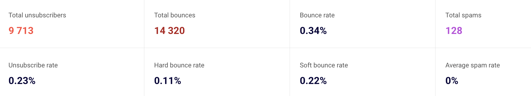 Below the chart, you’ll find important email health metrics that help you monitor the health of your email list and identify potential deliverability issues: