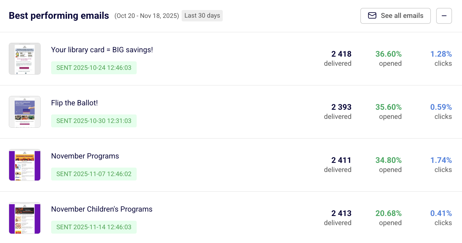 Click “See all emails” in the top right corner to view your complete campaign list and dive deeper into individual campaign performance.
