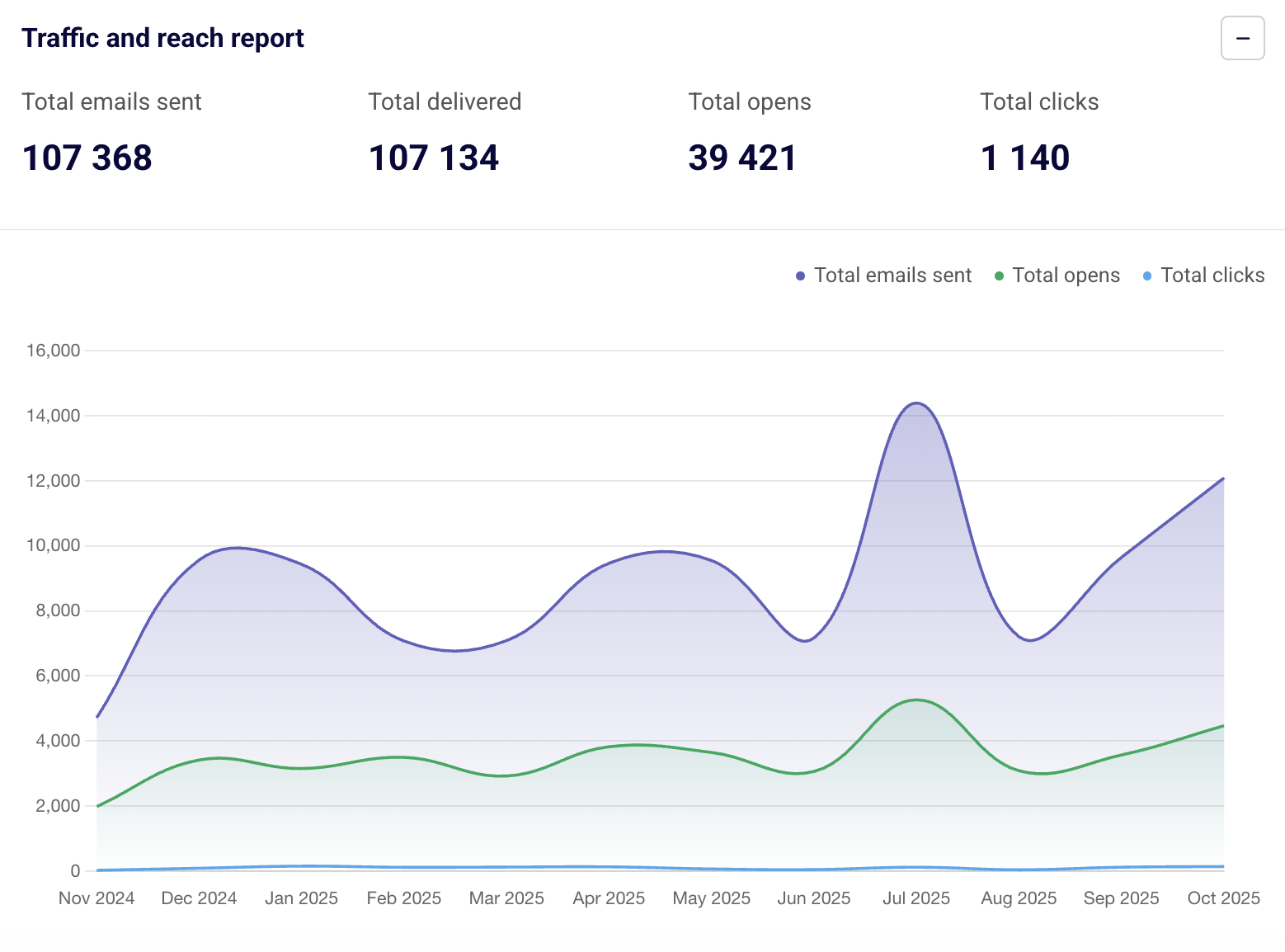 The traffic and reach section shows engagement metrics for all emails sent during your selected period. Track how many people are clicking through your campaigns and opening your messages.