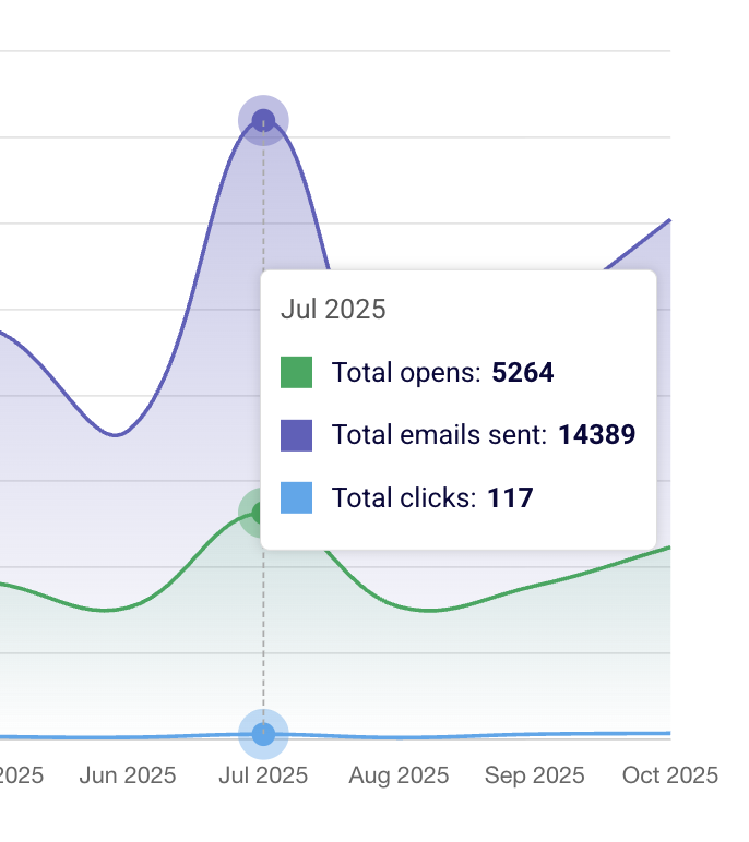 The main chart displays three trend lines over time showing total emails sent, total opens, and total clicks. This visualization helps you understand engagement patterns and identify peaks in your email activity.