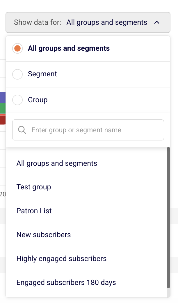 When you select a filter option, a search field appears where you can type to find specific groups or segments from your list. This filtering capability helps you understand which segments are growing fastest and where your best subscribers are coming from.