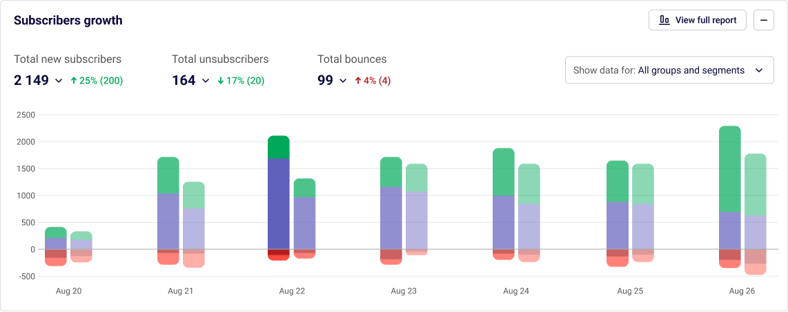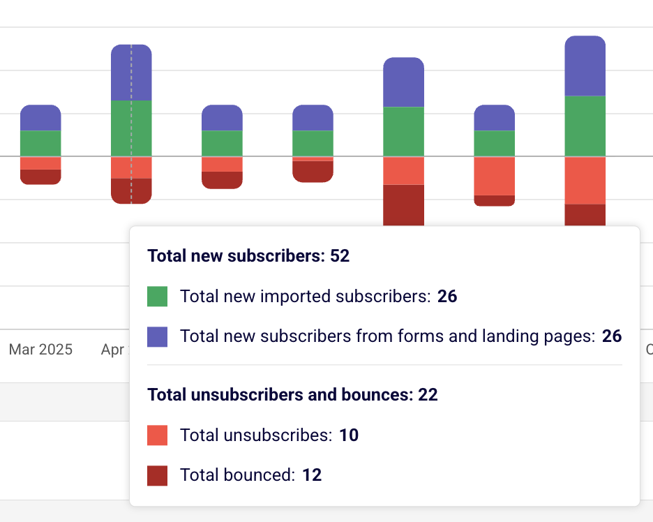 The stacked bar chart displays your net subscriber growth over time. Each bar uses color-coding to show new subscribers, existing subscribers, and losses from unsubscribes and bounces. This visualization makes it easy to spot trends and see the overall health of your list.