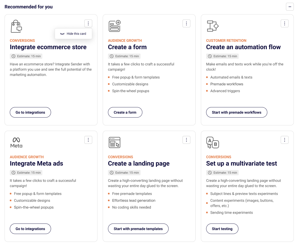 Get personalized suggestions to maximize your email marketing performance under the “Recommended for you” heading. Sender analyzes your account activity and provides actionable recommendations tailored to your needs.
