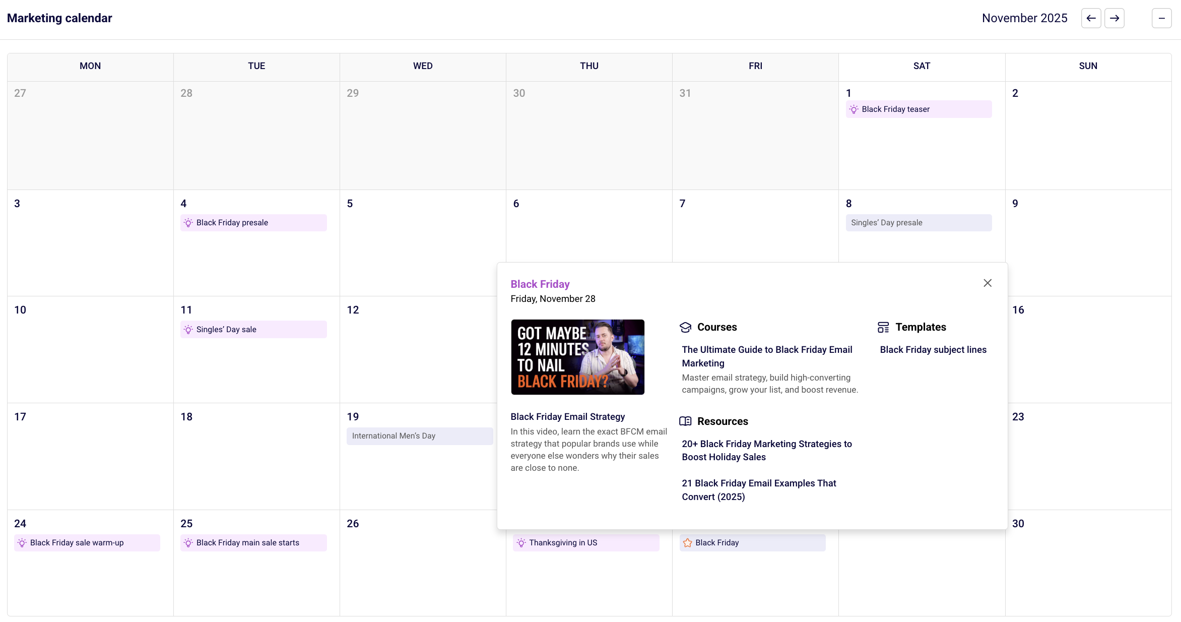 • Holiday markers – Important dates like Halloween, Thanksgiving, Black Friday, Diwali, and other seasonal events. These also include educational materials on marketing strategies for these holidays.